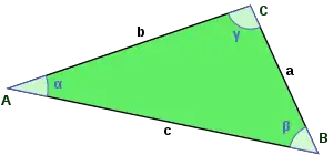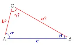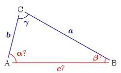Se especifican las longitudes de los tres lados a, b, c. Para encontrar los ángulos α, β, puede ser utilizado el teorema del coseno:[3]