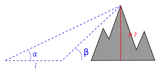 Si se quiere medir la altura h de una montaña o un edificio alto, se determinan los ángulos α, β desde dos puntos del terreno a la parte superior. Sea l la distancia entre estos dos puntos. De las fórmulas del caso ALA se obtiene:
