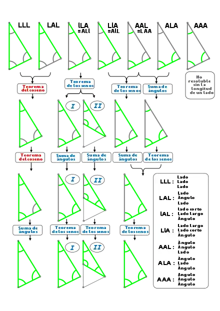 - (Para que el problema tenga solución, se debe verificar necesariamente que "la suma de las longitudes de los dos lados más cortos, tiene que ser mayor o igual que la longitud del lado más largo". En caso contrario, es inmediato comprobar que no se puede formar un triángulo con ellos; o lo que es equivalente, en las fórmulas propuestas, se obtendría un coseno mayor que 1 o menor que -1, lo que deja sin solución el problema.)