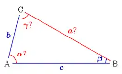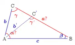 Este problema no es resoluble en todos los casos; la solución será única solo si la longitud del lado adyacente al ángulo es más corta que la longitud del otro lado. Se supone que se conocen dos lados b, c y el ángulo β. La ecuación para el ángulo γ puede obtenerse del teorema de los senos:[7]