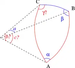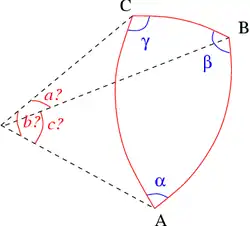 Un triángulo esférico general se determina completamente por tres de sus seis características (3 lados y 3 ángulos). Debe tenerse en cuenta que los lados a, b, c de un triángulo esférico se miden por unidades angulares en lugar de lineales, basadas en los ángulos centrales correspondientes.