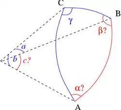 Conocidos: los lados a, b, c (en unidades angulares). Se calculan los ángulos del triángulo mediante el teorema del coseno (esférico):