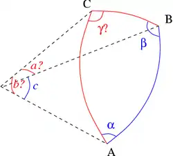 Conocido: el lado c y los ángulos a, ß. Primero se determina el ángulo de γ con el teorema del coseno esférico: