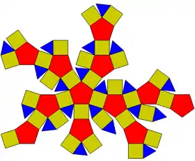En la geometría, el rombicosidodecaedro es un sólido de Arquímedes. Tiene 62 caras (12 pentágonos, 30 cuadrados y 20 triángulos), 120 aristas y 60 vértices.[1] Este sólido se obtiene como dual del hexecontaedro deltoidal, por expansión del dodecaedro o biselando las aristas de un dodecaedro.