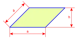 Considerando el romboide de lados a y b, y de altura h respecto al lado a, llamado base, se pueden determinar las siguientes medidas: