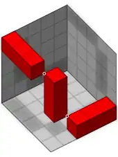 Una posible ubicación para los tres bloques de 1 × 1 × 3. El bloque vertical tiene esquinas que tocan las esquinas de los dos bloques horizontales.