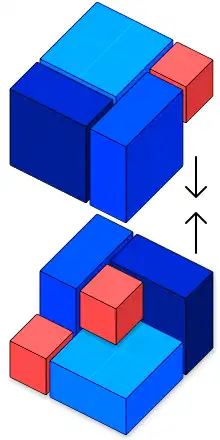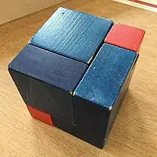 El rompecabezas es esencialmente el mismo si se omiten los tres bloques de 1×1×1, de modo que la tarea es empaquetar seis bloques de 1×2×2 en una caja cúbica con volumen 27.