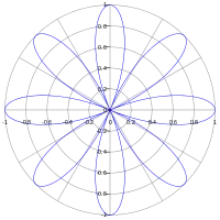 - Cuando es par y es impar, o viceversa, la rosa se representará completamente en un intervalo de ángulo polar continuo largo.[4] Además, las rosas son simétricas con respecto al polo tanto para las expresiones del coseno como del seno.[10]