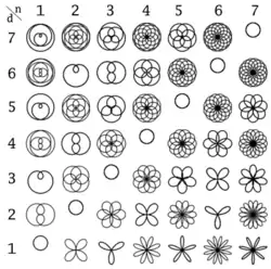 Cuando es un número entero distinto de cero, la curva tendrá forma de rosa con pétalos si es par, y pétalos cuando es impar.[5] Las propiedades de estas rosas son un caso especial de rosas con frecuencias angulares que son números racionales, comentado más adelante.