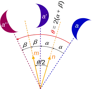 Una rotación en el plano se puede formar al componer un par de reflexiones. Primero, se calcula la reflexión de un punto P para obtener su imagen P′ al otro lado de la recta L1. A continuación, se calcula la reflexión de P′ para obtener su imagen P′′ al otro lado de la recta L2. Si las rectas L1 y L2 forman un ángulo θ entre sí, entonces los puntos P y P′′ formarán un ángulo de 2θ alrededor del punto O, intersección de L1 y L2. Es decir, el ángulo POP′′ medirá 2θ.[1]