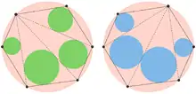 En la imagen se muestran dos triangulaciones de un hexágono inscrito, formando las circunferencias verdes y azules respectivamente. Por el primer teorema japonés:
