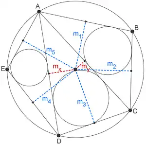 Consideremos la triangulación de un 5-polígono convexo inscrito en una circunferencia de radio R. Sean m1, . . . ,m5 los segmentos de mediatrices (o simetrales) desde el circuncentro a los lados. Sean r1, r2 y r3 los radios de las circunferencias inscritas en los triángulos ΔABC, ΔACD y ΔADE respectivamente. Aplicando el teorema de Carnot a estos triángulos obtenemos: