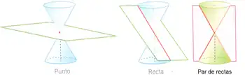 Se denomina sección cónica degenerada a la intersección de un cono circular recto de dos hojas con un plano que pasa por su vértice. Se clasifican en tres tipos: punto, recta y par de rectas.