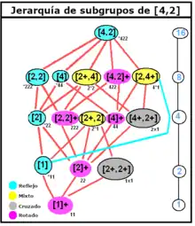 Ejemplo de árbol de subgrupos de simetría para la simetría diédrica: D4h, [4,2], (*224)