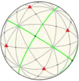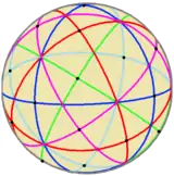Las aristas de un compuesto de cinco octaedros esférico representan los 15 planos de espejo como círculos máximos de colores. Cada octaedro puede representar 3 planos de espejo ortogonales por sus bordes. La simetría piritoédrica es un subgrupo de índice 5 de la simetría icosaédrica, con 3 líneas de reflexión verdes ortogonales y 8 puntos de giro de orden 3 en rojo. Hay 5 orientaciones diferentes de simetría piritoédrica.