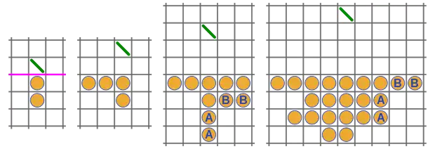 Arreglos de soldados de Conway necesarios para alcanzar las filas 1, 2, 3 y 4. Las posiciones marcadas con B son alternativas a las posiciones marcadas con A.
