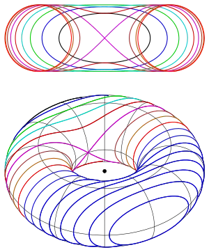 - Si c = 0 la curva consiste en dos circunferencias de radio r centradas en (-R, 0) y (R, 0). La ecuación cartesiana se reduce a