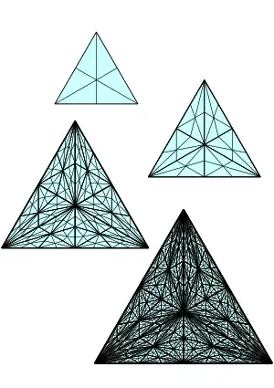 Supóngase entonces para un símplex de dimensión que sus caras de dimensión ya están divididas. Por lo tanto, existen símplices que cubren . La subdivisión baricéntrica se define entonces como el complejo simplicial geométrico cuyos símplices máximos de dimensión son cada uno de ellos envolventes convexas de para un par tal que algún , por lo que habrá símplices que recubran .