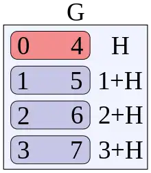 Puesto que a es inversible, la función dada por es una biyección. Por tanto, cada clase lateral de H contiene tantos elementos como el subgrupo H; el mismo H es la clase lateral representada por eH. Las clases laterales izquierdas forman una partición de G: todo elemento de G está contenido en exactamente una y solo una clase izquierda de H, o dicho de otro modo, G es la unión disjunta de las clases laterales izquierdas de H.[9]