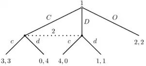 Los juegos en forma extensiva pueden modelar también juegos de movimientos simultáneos. En esos casos se dibuja una línea punteada o un círculo alrededor de dos vértices diferentes para representarlos como parte del mismo conjunto de información (por ejemplo, cuando los jugadores no saben en qué punto se encuentran).