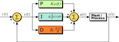 Si u(t) es la señal de control enviada al sistema, y(t) es la salida medida y r(t) es la salida deseada, y e(t) = r(t) − y(t) es el error registrado, un controlador PID tiene la siguiente forma general