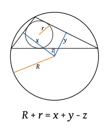 donde r es el radio del círculo inscrito en el triángulo y R es el radio del círculo circunscrito del triángulo. Aquí, el signo de la distancia es negativa si, y solo si el segmento DX (X = F, G, H) esta completamente fuera del triángulo. En la imagen de abajo (el caso de un triángulo obtusángulo) DF es negativo y los segmentos DG y DH son positivos.