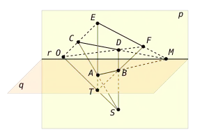 ![]() El plano determinado por los puntos SAB corta al plano p sobre la recta CD. El punto M se encuentra sobre el dicho plano, por estar sobre la recta AB y por esta razón M se halla sobre la recta CD. Usando los mismos argumentos, pero considerando ahora el plano TAB, se demuestra que el punto M es común a las rectas AB y EF. Así, las rectas CD y EF se cortan en el mismo punto M sobre la recta r. Sea O la intersección de la recta ST sobre el plano p. El plano STA corta al plano p sobre la recta CE que contiene al punto O. De manera similar, el plano STB corta al plano p en la recta DF que también contiene al punto O. Por tanto, las rectas CE y DF se cortan en dicho punto. De modo que los pares de puntos C, E y D, F son proyectivos desde el punto O. Las rectas CD y EF son proyectivas desde la recta r. El recíproco también es cierto: Si las rectas CD y EF pertenecen al mismo plano p, son proyectivas desde una recta r y los puntos correspondientes C, E y D, F son proyectivos desde un punto O en dicho plano, entonces existe un plano q, secante al plano p en r, una recta AB sobre dicho plano y un par de puntos exteriores a ambos planos desde los cuales la recta AB se proyecta sobre CD y EF, el punto A sobre C y E, y el punto B sobre D y F. En el teorema de Desargues, podemos considerar los triángulos como las proyecciones de un único triángulo sobre algún plano q desde dos puntos distintos S y T. La recta r y el punto O son respectivamente, la intersección del plano q con aquel donde los dos triángulos son proyectivos y la intersección de la recta ST con aquel plano. Los vértices correspondientes en ambos triángulos serán proyectivos desde el punto O y los lados correspondientes de ambos triángulos serán proyectivos desde la recta r. Esto demuestra el teorema. |