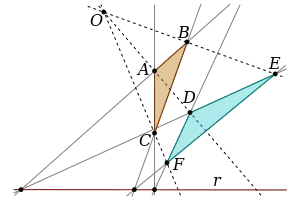 Considere los triángulos ABC y DEF. El que los triángulos sean proyectivos desde un punto significa que las rectas AD, BE y CF concurren en un mismo punto O. De modo parecido, el que los triángulos sean proyectivos desde una recta significa que los pares de lados (AB, DE), (BC, EF) y (AC, DF) se cortan respectivamente sobre una misma recta r.