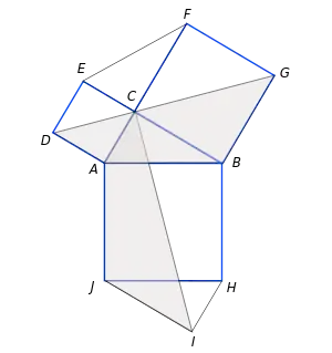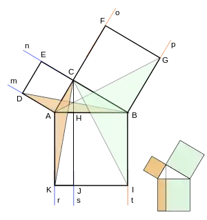 Se tiene el triángulo ABC, rectángulo en C (véase Figura Euclides 3), y se construye los cuadrados correspondientes a catetos e hipotenusa. La altura CH se prolonga hasta J. Seguidamente se traza cuatro triángulos, iguales dos a dos: