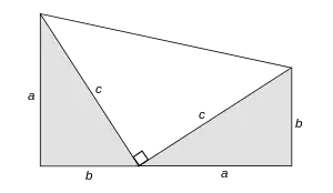 Si a cada uno de estos cuadrados les quitamos los triángulos, evidentemente el área del cuadrado gris () equivale a la de los cuadrados amarillo y azul (), habiéndose demostrado el teorema de Pitágoras.