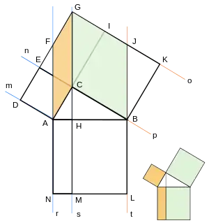 - Las paralelas r y s comprenden al triángulo ACK y el rectángulo AHJK, los cuales tienen la misma base, AK. Por tanto de acuerdo con la proposición I.41[9] de Los Elementos, AHJK tiene doble área que ACK, (véase Figura Euclides 1).
