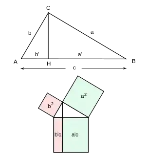 Sea el triángulo ABC, rectángulo en C. El segmento CH es la altura relativa a la hipotenusa, en la que determina los segmentos a’ y b’, proyecciones en ella de los catetos a y b, respectivamente.