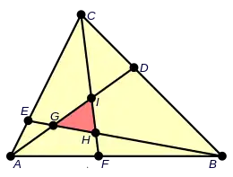 Los puntos I, G y H conforman al triángulo interior ΔIGH (color rojo el en el gráfico). Donde I, G y H son los puntos de intersección de las cevianas (AD con CF), (AD con BE) y (BE con CF).