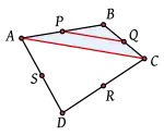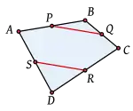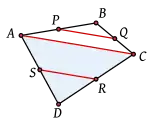 ![]() Sean A, B, C, D los vértices del cuadrilátero y P, Q, R, S los puntos medios de sus lados. ![]() Obsérvese que P, Q son puntos medios de dos lados del triángulo ABC y, por una consecuencia del teorema de Tales, PQ es paralela a la línea AC. ![]() De manera similar, R, S son puntos medios de dos lados del triángulo CDA y al igual que arriba, RS es una línea paralela a la línea CA. ![]() Pero si tanto PQ como RS son paralelas a AC, entonces son paralelas entre sí. Es decir, PQ es paralela a RS. ![]() Un argumento similar demuestra que tanto PS como QR son paralelas a la línea BD y por tanto paralelas entre sí. Pero entonces se ha demostrado que los lados opuestos del cuadrilátero PQRS son paralelos y por tanto éste debe ser un paralelogramo. ![]() En relación con las áreas, hay que observar que el área del triángulo BPQ es la cuarta parte del área del triángulo ABC. De manera similar, el triángulo SRD tiene la cuarta parte del área del triángulo ACD. Por tanto, la suma de las áreas de los triángulos BPQ y SRD es un cuarto del área del cuadrilátero. Pero de manera similar, las áreas de los triángulos APS y QCR suman un cuarto del área del cuadrilátero. Esto quiere decir que si sumamos las cuatro áreas BPQ, CQR, RSD y PSA obtendremos la mitad del área del cuadrilátero y por tanto, el área del paralelogramo de Varignon debe ser exactamente igual a la mitad del área restante. La prueba anterior puede adaptarse sin mayor problema al caso en que el cuadrilátero es cóncavo, terminando así la prueba. |