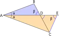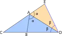 ![]() Dado un triángulo ABC y una bisectriz AD, al construir el triángulo isósceles CDE, CD=CE se tiene una semejanza(de tipo AA) entre los triángulos ABD y ACE, quedando así demostrada la relación de proporcionalidad de los triángulos iniciales.