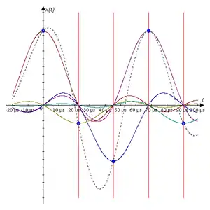 - Es un error creer que los puntos que resultan del proceso de muestreo se unen en la reconstrucción mediante rectas, también denominada interpolación lineal. Esto formaría dientes de sierra en la señal obtenida, representadas por muestras con una frecuencia de valores discretos siempre menor a la continuidad analógica. Por el contrario, el proceso de cálculo de la interpolación se realiza de manera predictiva. El teorema de muestreo demuestra que toda la información de una señal contenida en el intervalo temporal entre dos muestras cualesquiera, está descrita por la serie total de muestras, siempre que la señal registrada sea de naturaleza periódica -como lo son las ondas mecánicas del sonido, o las ondas electromagnéticas-, y no tenga componentes de frecuencia igual o superior a la mitad de la tasa de muestreo; en cuyo caso no será necesario predecir la evolución de la señal entre muestras para obtener la representación continua de la señal.
