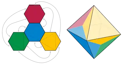 De manera similar, un cubo tiene un defecto de Π/2 en cada uno de sus ocho vértices. Una propiedad del defecto angular (según el teorema de Gauss-Bonnet) establece que la suma de los defectos angulares de todos los vértices es siempre exactamente 4Π. En resumen, el desarrollo de un poliedro convexo es geodésico, homeomorfo (topológicamente equivalente) a una esfera, y localmente euclídeo excepto por un número finito de vértices cónicos cuyo defecto angular suma 4Π.[3]