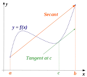 De manera precisa el teorema enuncia que si es una función continua en un intervalo cerrado y diferenciable en el intervalo abierto entonces existe un punto en tal que la recta tangente en el punto es paralela a la recta secante que pasa por los puntos y , esto es