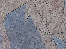 El Federation Square, un complejo de edificios en Melbourne, (Australia), utiliza como motivo decorativo de las fachadas el teselado de molinillo. En el proyecto, los patrones de enlosado, prefabricados en un taller, quedaban enmarcados en las fachadas. Estaban basados en elementos triangulares individuales, compuestos por piezas de cinc, cinc perforado, arenisca o vidrio, unidos a otras piezas similares sobre un marco de aluminio, para formar un "tablero". Cinco de estos tableros se fijaban a un marco de acero galvanizado, formando un "mega-tablero", que a su vez era fijado a los marcos de soporte de las fachadas. La orientación rotacional de las piezas da a las fachadas un aspecto aleatorio, una calidad de composición incierta, incluso aunque el proceso de su construcción está basado en la prefabricación y la repetición. El mismo sistema de teselado se usó en el desarrollo del marco estructural tridimensional y del vidriado del "Atrio" de Federaction Square.