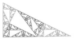 Se genera un fractal por iteración, dividiendo cada triángulo en cinco copias isométricas siguiendo la construcción de Conway, y descartando el triángulo central (ad infinitum). Posee una dimensión de Hausdorff-Besicovitch de .