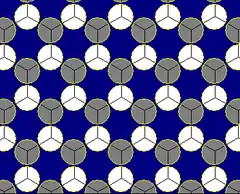 ![]() Teselado pentagonal tipo 3 con superposiciones de hexágonos regulares (cada uno abarcando 3 pentágonos). |