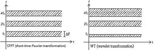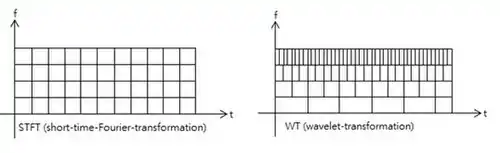 En otras palabras, la función de base Ψ puede ser considerada como una respuesta de impulso de un sistema con la función x(t) siendo filtrado. La señal transformada proporciona información sobre el tiempo y la frecuencia. Por tanto, la transformada de ondícula contiene la información similar a la transformada de fourier de tiempo corto, pero con propiedades especiales adicionales de las ondículas, los cuales aparecen en la resolución en tiempo en frecuencias de análisis más alto de la función de base. La diferencia en resolución de tiempo en frecuencias ascendentes para la la transformada de Fourier y transformada de ondícula está mostrado abajo.