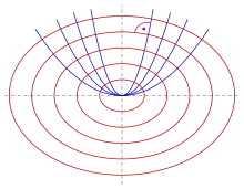 Por ejemplo, las trayectorias ortogonales de una familia de circunferencias concéntricas son las rectas que pasan a través de su centro común (ver esquema).