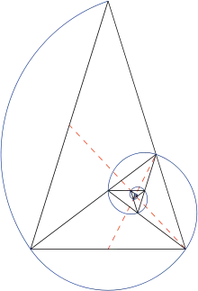 El triángulo áureo se usa para formar una espiral logarítmica. Al dividir los ángulos de la base, se crea un nuevo punto que, a su vez, crea otro triángulo áureo.[3] El proceso de bisección puede continuarse indefinidamente, creando un número infinito de triángulos áureos. Se puede dibujar una espiral logarítmica a través de los vértices. Esta espiral también se conoce como espiral equiangular, un término acuñado por René Descartes. "Si se dibuja una línea recta desde el polo a cualquier punto de la curva, se corta la curva exactamente en el mismo ángulo", por lo tanto, es "equiangular".[4]