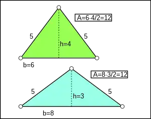 Una forma se llama ecuable si su área es igual a su perímetro. Hay exactamente cinco triángulos heronianos ecuables: los que tienen longitudes laterales (5, 12, 13), (6, 8, 10), (6, 25, 29), (7, 15, 20) y (9, 10, 17).[20][21]