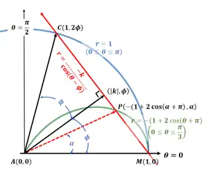 - Primero, se debe observar que la ecuación polar es un círculo con radio , centro en el eje polar y tiene un diámetro que es tangente a la línea en el polo . Denote el diámetro que contiene el polo como , donde está en .
