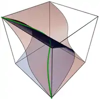 El siguiente ejemplo no es ni una hipersuperficie, ni un espacio lineal, ni un único punto. Sea A'3 el espacio afín tridimensional sobre C'. El conjunto de puntos (x, x 2, x 3) para x en C es una variedad algebraica, y más precisamente una curva algebraica que no está contenida en ningún plano.[note 3] Es la cúbica alabeada que se muestra en la figura anterior. Se puede definir mediante las ecuaciones