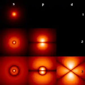 La función de onda asociada a los estados ligados de un electrón en un átomo de hidrógeno puede verse como los vectores propios del átomo de hidrógeno hamiltoniano así como al operador momento angular. Está asociada a los valores propios interpretados como sus energías (incrementándose según n=1,2,3,...) y al momento angular (incrementándose según s,p,d,...). Aquí se muestra el cuadrado del valor absoluto de las funciones de onda. Las áreas más iluminadas corresponden a densidades de probabilidad más altas para una posición. El centro de cada figura es el núcleo atómico, un protón.
