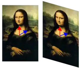 Fig. 1. En esta transformación de la Mona Lisa, la imagen se ha deformado de tal forma que su eje vertical no ha cambiado. (nota: se han recortado las esquinas en la imagen de la derecha). El vector azul, representado por la flecha azul que va desde el pecho hasta el hombro, ha cambiado de dirección, mientras que el rojo, representado por la flecha roja, no ha cambiado. El vector rojo es entonces un vector propio de la transformación, mientras que el azul no lo es. Dado que el vector rojo no ha cambiado de longitud, su valor propio es 1. Todos los vectores de esta misma dirección son vectores propios, con el mismo valor propio. Forman un subespacio del espacio propio de este valor propio.