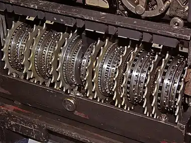 En Bletchley Park, los impulsos de marca se representaban con x y los impulsos de espacio con • .[nota 1] Por ejemplo, la letra "H" se codificaría como ••x•x.[15] La deducción de Tutte de los componentes chi y psi fue posible por el hecho de que era más probable que los puntos fueran seguidos por puntos, y que las cruces tenían más probabilidades de ser seguidas por cruces. Esto fue producto de una debilidad en la configuración de clave alemana, que luego eliminaron. Una vez que Tutte hizo este avance, el resto de la Sección de Investigación se unió para estudiar los otros impulsos, y se estableció que las cinco ruedas chi avanzaban con cada nuevo carácter y que las cinco ruedas psi se movían juntas bajo el control de dos ruedas mu o "motor". Durante los siguientes dos meses, Tutte y otros miembros de la Sección de Investigación trabajaron en la estructura lógica completa de la máquina, con su conjunto de ruedas con levas que podrían estar en una posición (elevada) que agregaba una x al flujo de caracteres del teclado, o en la posición alternativa que se agregaba en •.[16]